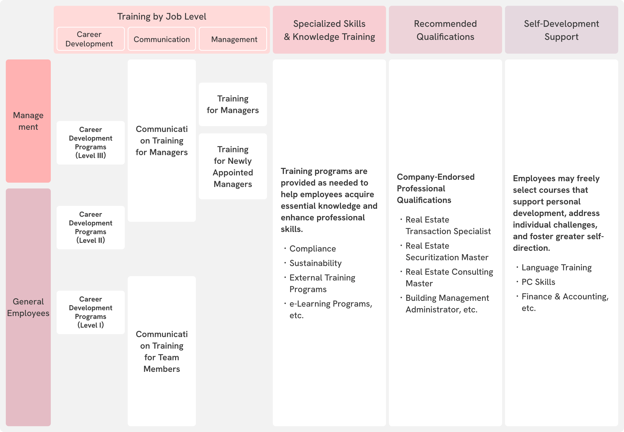 Based on the belief that the growth of employees is essential to the sustainable growth of the Company, we actively recruit not only individuals with a certain level of experience and skills, but also relatively less experienced individuals in their 20s to early 30s. We have also developed training programs designed to equip employees with a broad range of expertise and skills, and are committed to the continuous development of our human resources. In addition, in order to support each employee’s autonomous career development, we encourage self-development initiatives.